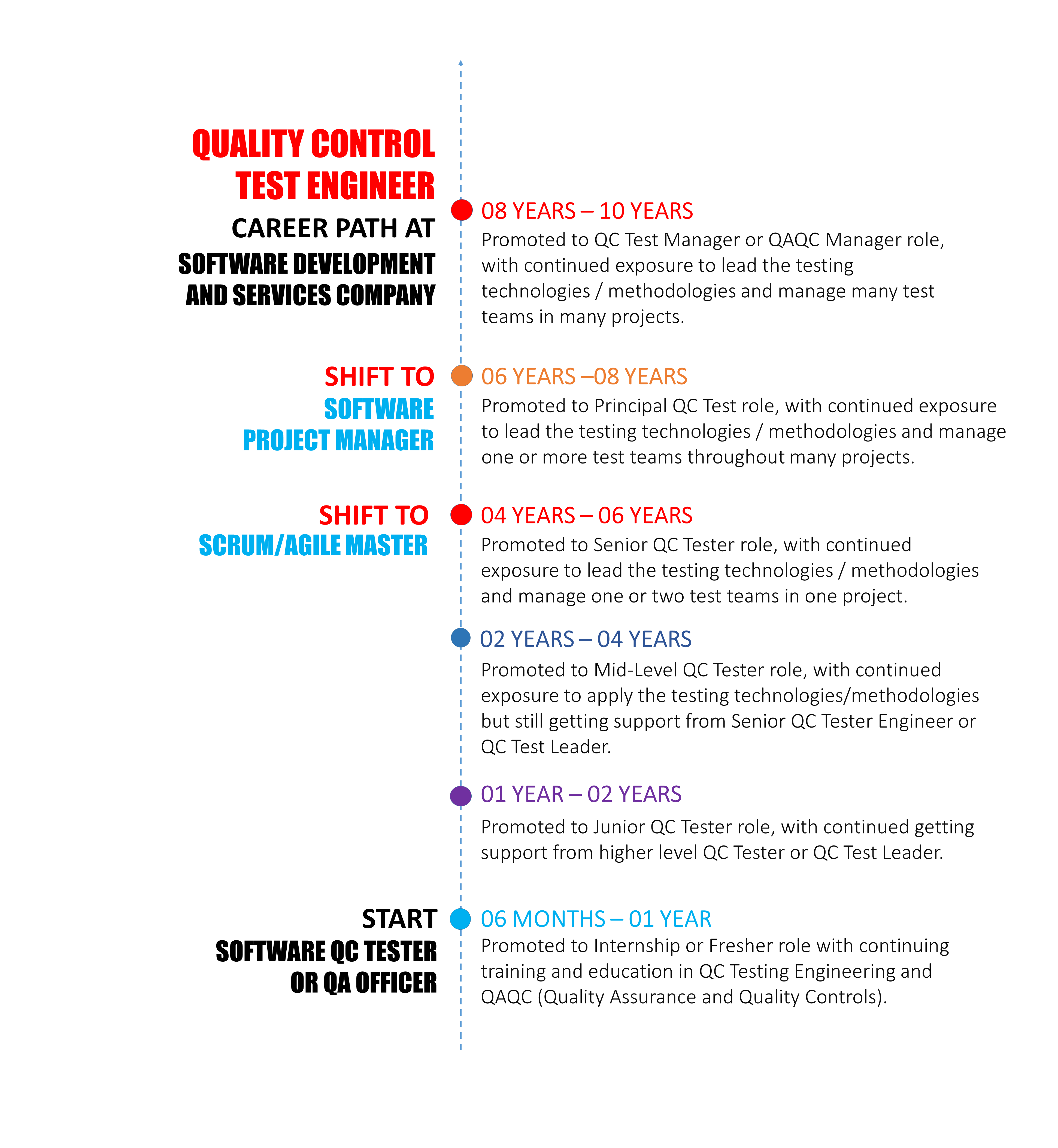 A test engineer can progress on the career path by improving work skills and by gaining experience, to software test lead, test manager, software quality assurance manager, and project manager.